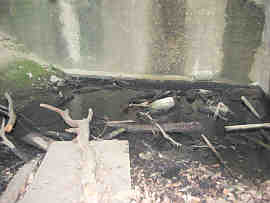 床の部分は周りよりも若干低くなっており、枯木と泥水に覆われている。近づくとピチャンと何かが跳ねて直ぐに静寂になった。なんとなく不気味だ。別の方角に目を向けると、石柱の隙間から屋外の新緑が鮮やかに見えた。泥沼と美林との対照的な風景である。 陽射しに映える不思議な景色は当時を偲ばせる。 他にも見学者がいて、大きさの比較ができる。トンネルも掘られていて、それを潜って向こう側に出ると、断崖絶壁の下に緑の谷が広がっていた。