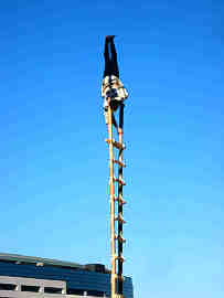 梯子を立て、鳶で支えて数人が交代で演技開始。妙技が決まるたびに観衆から大きな拍手が送られる。