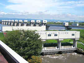 翻って大堰側を眺める。県道の武蔵大橋が併設されている。大堰は12門のゲートによって、渇水期と洪水期の水位調節をしている。