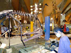 群馬県立自然史博物館は富岡市にある。富岡市といえば世界遺産の富岡製糸場で有名だ。博物館へのアクセスは、上信越自動車道の富岡ICで降りるのが便利だ。 今回は群馬広報のクイズで当たり、入場券2枚を贈られたからである。何年か前に一度見ているから2回目ということになる。 ところで現在、新型コラナウイルス感染症が発生している最中であり、見学は通常時に比べて異例の厳重さが求められていた。当面の間、時間指定・人数制限による事前予約制・入れ替え制である。 1日3部隊に分かれて各2時間の見学をするのであるが、僕らは第一部隊150名で9:30〜11:30の2時間である。今日は日曜日のせいか、ファミリーが結構多い。3密など気にしないであちこち歩き回る。親もあまり注意をしない。学芸員もなぜか遠慮している。そのうち子供達は飽きやすくて親の手を引っ張って先へ行ってしまった。 右側の写真はボーンベッド。Wikipediaによれば、古生物の骨や骨の破片を多量に含む特定の地層または堆積物のことをいうとある。 ガラスの床の上に、おっかなびっくり載る。歩くのが恐いくらいだ。掘削をする作業員はマネキンを使っている。