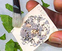 桑の葉を鋏で1cm角ぐらいに切って、ネットの上に置きます。その上に、柔らかい水彩用の絵筆を使って、うごめいている蟻蚕を静かに葉の上に落とすのです。30分くらいかかって、とりあえず孵化した分を掃き立てしました。
