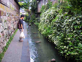- やなか水のこみちは、繁華街の新町から、角を曲った路地にある。玉石を敷きつめた道と水路、柳の並木、大きな家屋敷が並んでいる。水飲み場がアクセントを示している。