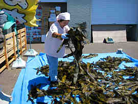 - 仙法志御崎公園で、ようやく利尻山が姿を現した。ここには利尻昆布の製造直販店があって、見学と味見を楽しめる。利尻昆布は今が採取の季節である。今しも店前で昆布の乾燥に余念がない。