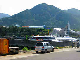 - 羽田8:15分発。鹿児島空港からバスで移動し、鹿児島市の南埠頭から屋久島までは、高速船ジェットフォイルにてアクセス。船名の「トッピー」は、屋久島の方言でトビウオのことをいう。その名のごとく波頭をこえて、穏やかな海面を80km/hで走行する。宮之浦港が近づいた。空を画する稜線の最高峰-宮之浦岳と、その右に永田岳が望める。埠頭に入港すると、この二つの峰は手前の山に隠れてしまう。これは島の山麓の全体に言えることで、島から離れない限り、仰ぎ見ることができないのである。日常の生活の中で、見ることのできない山塊を、島の人たちは「奥岳」と呼んでいた。帷(とばり)に包まれた神秘な世界である。・・・かくて、宮之浦港に14:55分着。