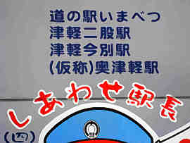 - 津軽半島の東側、陸奥湾に沿って、国道280号を北進し、蟹田から津軽線に沿うように県道を内陸に入る。今別町に入ってすぐに話題の駅に着く。”津軽今別駅”と、”津軽二股駅”の二つである。前者はJR北海道の海峡線の駅として、青函トンネル本州側の入口に位置する駅で、将来は北海道新幹線の(仮称)奥津軽駅になる。後者はJR東日本の津軽線”津軽二股駅”である。特急「スーパー白鳥」と「白鳥」が停車する。駅舎は無人で一つしかない。もう一つ、駅舎内には”道の駅いまべつ”があり、土産物を売っている。この駅舎は、言ってみれば3駅共同体と言ったところだ。