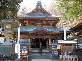 - 寺務所前の木の間に浅間山の眺望が素晴らしい。大岩をくり抜いた隧道を抜けると、観音堂がある。清水寺を思わせる櫓が組まれた舞台形式になっている。岩壁に造ったので、奥行きはない。