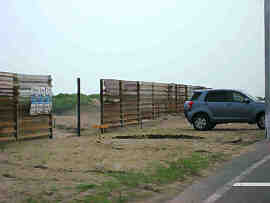 - やがて防砂林の続く新潟砂丘へ入る。この砂丘は村上市までの80kmに及ぶ長大な規模である。国道から一段低くなって、不規則かつ緩やかな起伏の広大な畑地が広がっている。ちょうど花時のタバコと何を作っているのか分からないが、トンネル栽培が行なわれている。道路の海側には飛砂防止柵が設置されている。