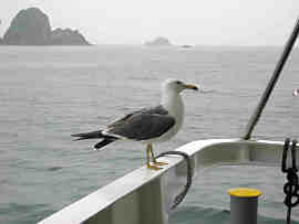 - 夜半に雨が降って、朝には小やみになった。「笹川流れ」が今日の見どころであったが、はたして遊覧船が出港するほどの客が集まるか心配であった。海は穏やかだし、とにかく行くことにした。最初僕たちだけだったが、9時には出港すると舟屋の人たちは自信をもっていう。果せるかな、5分ほど前になったとき観光バスが2台やってきた。予約客であろう。見事な景観を誇る延長11kmの笹川流れ。中心地の笹川集落にちなんで名付けられた国の名勝天然記念物に指定されている。一周40分の笹川流れ周遊コースである。眼鏡岩・恐竜岩・鷹ノ巣岩・びょうぶ岩などの奇岩が連続する。潮風に当たりながらカモメの餌付けも体験できる。