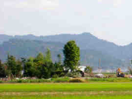 - ホテルを出発してしばらくは、通勤時の市街地で渋滞したが、田園地帯に出ると嘘のように車は減った。内湖を埋め立てた干拓地である。信号のない湖岸道路がどこまでも続く。広大な農園が続き、右手には琵琶湖を越して霞んだ稜線が遠い。