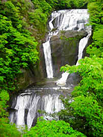 - 袋田の滝は、久慈郡大子(だいご)町袋田にある滝。久慈川支流の滝川上流にあたり、長さ120m、幅73m。冬の氷瀑はテレビで放映されることがある。華厳滝、那智滝とともに日本三名瀑のひとつに挙げられる。観瀑トンネルを通り、エレベーターで新観瀑台に昇ると、そこからは四段の滝の全景が望める。昨夜の雨で水量は豊富とみえて、霧状の飛沫が顔にかかる。