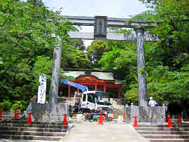 - 2011年3月11日の東北地方太平洋沖地震により、二の鳥居・御手洗池鳥居が崩落し、多くの灯篭が倒れたり、池の水が少なくなったりしたが、国宝や重要文化財が損傷するという最悪の事態にはならなかったという。