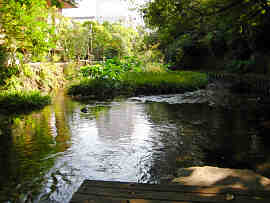 ここも三島溶岩流による湧水群である。柿田川公園の西側に第一展望台から見られるのが原水池だ。わき間と呼ばれる湧水の噴出口は、大小数十か所と云われる。間欠的に噴出す砂地があるかと思えば、ユラユラと砂地全体がうごめいたりしている。それらの湧水が集まり、川となって水藻をくねらせながら流れを形成している。いたるところにアユなどの魚が泳いでいる。
