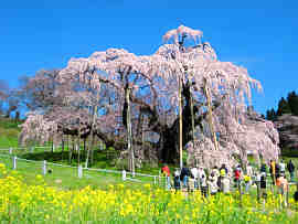 それはそうと、参道が黄土色の岩石で他では見たことがない岩石なのだ。 今夜の宿は福島市の北側に位置する名湯-飯坂温泉。摺上川とその支流を挟んで旅館やホテルが立ち並んでいる。泊まったホテルはU字峡谷の縁に屹立していて、大地震で崩れ落ちるのではないかと心配になった。 <三春-滝桜> 樹齢推定が1,000年超のベニシダレザクラの巨木で、国の天然記念物である。旅行計画で花めぐりの時期を決めるのは難しい。今回はライブカメラで、枯れ木にピンク色が挿し始めたのは4月4日であった。これを常時チェックして満開は15日前後と推定し、飯坂温泉の宿を予約したのである。ドンぴしゃり、15日が大当たり満開の初日で天候にも恵まれた。 滝桜という名は、四方に広げた枝から薄紅の花が流れ落ちる滝のように咲き匂うということに由来するという。大正11年(1922)国の天然記念物に指定された。
