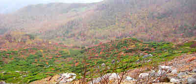 僕らは茶臼岳の南面をほぼ等高線に沿って東に向かい、ロープウェイの山頂駅に戻った。茶臼岳の8合目を鉢巻状に360度の展望を楽しみながら、約3時間のコースタイムであった。結局、ロープウェイの山麓駅に下った辺りが、紅葉の見頃だったのである。
