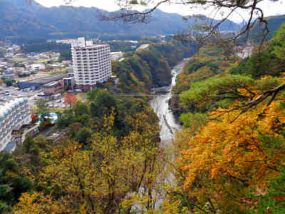 翌日、ホテルのすぐ近くの大吊橋を対岸に渡った。ユラユラと揺れて恐い。振り返って見るとこんな感じ。