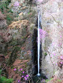 歩いて100mほど下ると、「線ヶ滝」の説明板や東屋と大日如来の立像が立っている。線ヶ滝の観瀑台と直下に螺旋階段の展望台もある。この滝は群馬県指定天然記念物である。南牧川支流の星尾川の流れを切って走る断層帯に沿って形成された断崖にかかる落差35mの滝である。地質学に興味のある人ならずとも一見に値する。ちょうどアカヤシオの花が咲いていた。