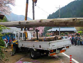 柱は次第に垂直に近づき、遂に柱の根元が底に到達する。さらに左右前後から建ち具合を確認し、その上で、石を投げ込む。ワイヤーを緩めると、それがソメイヨシノの梢に当たり、花吹雪が舞い上がり、観衆から一斉に拍手と万歳が沸き起こった。