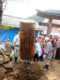 狭い境内だが正面に鳥居がある。それをくぐると参道の右側に6年前に建てられた旧御柱が立っている。これを撤去する作業が始まる。