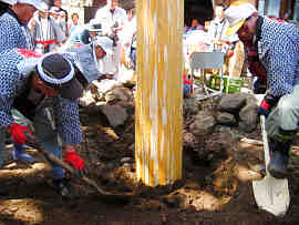 この後、地表の地均しをし、竹と注連縄で飾って宮司のお祓いと祝詞で建御柱の祭事が13:30頃に無事終了した。