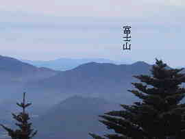 - 北東に志賀高原の横手山(2,305m)。頂部を斜めによぎっているのは、志賀草津道路。その左は奥志賀高原の岩菅山(2,295m)である。東に日光連山が関東平野の霞の向うに浮かんでいる。
