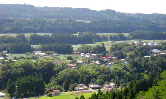 展望台から道路を挟んで反対側の細い山道を登る。目指すは雨乞山で河岸段丘を一望するならここだと聞いていたのであるが、急斜面であまり車が通った様子がない。間もなく車道は途絶えて完全な山道となった。行き止まりで鬱蒼とした森となった。熊出没注意の看板を見て引き返すことにした。途中開けた畑地から河岸段丘が見えたので写真を撮った。