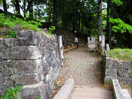 要所に説明板により解説されている。馬場がこの先の一段上にあって、そこまでの通路を馬場下と呼ぶのだろう。石垣や木製の橋、あるいは石畳が尾根に築かれている。