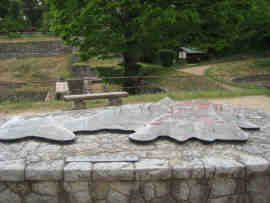 大手虎口は複雑な石積みになっている。両側に石垣があり、通路はゆるい幅広の石段、その両側に排水側溝が設けられている。その排水が月ノ池に流れるのだろう。