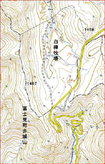 もと来た道を引き返し、姫百合駐車場に戻った。実はもう一箇所見たい所があったのである。車に乗って白樺牧場に向かった。標高は鍋割山とほぼ同じ。黄色い道を北上する。