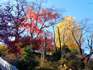 達磨堂を背にして下段側に目を転じると、そこにはモミジとイチョウ。さらにその先にもモミジの遊歩道が続いている。