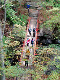 八ッ場ダム/シリーズ17<2020.10.28> シリーズ13で、ダムの試験湛水中に台風19号の洪水に襲われたことを述べた。ダム本体は影響なかったが、群馬県内の各所で土砂崩れが頻発した。鉄道や道路は遮断され、人家は潰され死者・負傷者が続出した。 今年はどうかと思い、地元の観光協会に問い合わせたところ、復旧して通れるとの情報を得た。10月28日今日がその日である。思わずラッキー!と叫んだ。たまたま嬬恋村に所用があって、その帰りに吾妻峡を見ることにした。現地の十二沢パーキングは、すでに満車状態。幸いここを引き上げる県外車を見つけて駐車することができた。 駐車場から渓谷に下りると猿橋がある。そこから撮った写真が十二沢の白絹の滝である。猿橋を左岸の旧国道に渡り、上流へ0.4km程進むと眼下に鹿飛橋が見える。