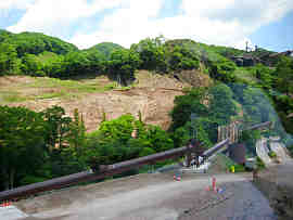 群馬県には全国一の郷土かるたがある。その「や」の札はこうだ。 耶馬溪しのぐ吾妻峡 耶馬溪は大分県中津市であるが、吾妻峡も観光資源として重要な存在である。現在、散策路が右岸の高みに設けられていて、春には新緑、秋には紅葉を楽しむ観光客が多い。 ダム構想は当初、この狭い吾妻峡が狙い撃ちされた。ところが、吾妻峡は昭和10年(1935)国の名勝に指定されていた。当時の吾妻町は大反対。そしてダムの上流側には川原湯温泉がある。それが水没してはたまらないと長野原町も反対した。それから長い闘争期間を経て、吾妻峡を出来るだけ残すようにダムを上流側にずらした。漸く両自治体と調印し、関連事業の国道付け替え・水没者の代替地造成・県道の整備・JR吾妻線の付け替え等の工事に着手した。 ダムの下流側を一望できる場所から撮った写真がこれ。四つの水門下部工が次第に出来つつある。