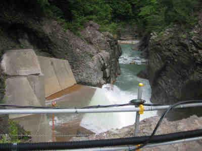 ダムの下流側を見学。そこには仮排水トンネルの出口から、右側へ滝のように水が勢い良く飛び出している。そして画面の向うは浸食崖の切立った狭い峡谷である。青い水が流れている吾妻峡に接続されているのだ。