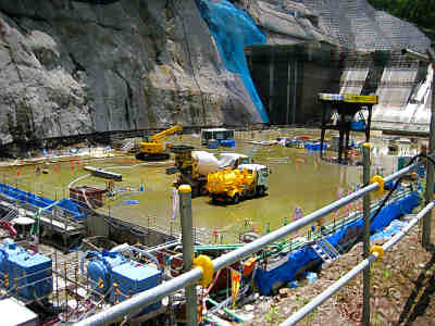 Compacted Concrete Damの略である。セメントの量を少なくした、超固練りのダムコンクリートをブルドーザーで敷き均し、震動ローラーで締め固める工法で、コンクリートダムをいかに早く安く打設できるのかを研究して開発されたものだという。現在コンクリート打設は、堤高116mに対して17%の20mほど立ち上がっている。 多種多様の作業が、あっちこっちで展開されているが、いったい何が行なわれているのか、さっぱり分らない。言えることは、全ての機械が無駄なく効率的に動いているらしいということだ。