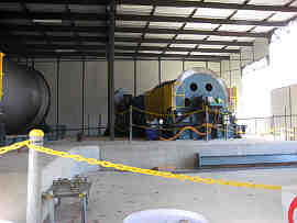 こげ茶色のサイロは骨材・セメントなどのサイロである。骨材は骨材プラントからベルトコンベアで運ばれてくる。