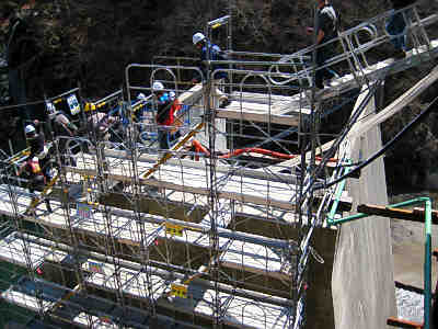 足場の直下約30mの位置に「堤外仮排水路」がある。つまりダム堤体の工事をしている期間に、吾妻川の上流から流れてくる水のほかに、堤体そのものの工事廃水とがある。その両方をダム下流に放出しなければならない。そのために堤体最下部に設けたトンネルが「堤外仮排水路」と呼ばれるものである。